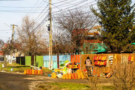 Romanian peasants selling vegetables and fruits on the road in Targoviste, Romania, 2021
