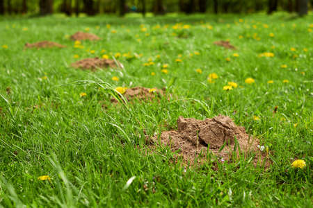 Photo of damaged and destroyed meadow near the forest with mole and group of molehills on sunset. A heap of european molehills (soil) on the lawn and grass in springtime.