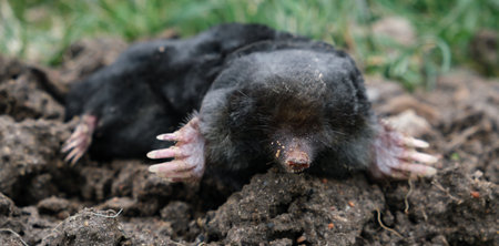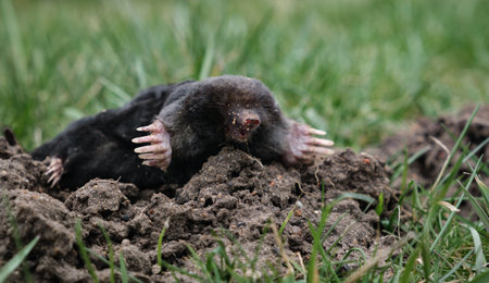Mole crawling out of molehill above ground. Strong front paws used for digging runs underground. Mole trapping, pest control. Underground creatures damage lawn. Europaea talpa