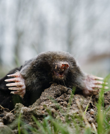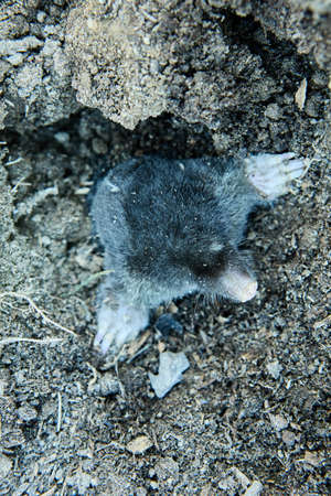 Mole crawling out of molehill above ground. Strong front paws used for digging runs underground. Mole trapping, pest control. Underground creatures damage law. Europaea talpa. High quality photo.