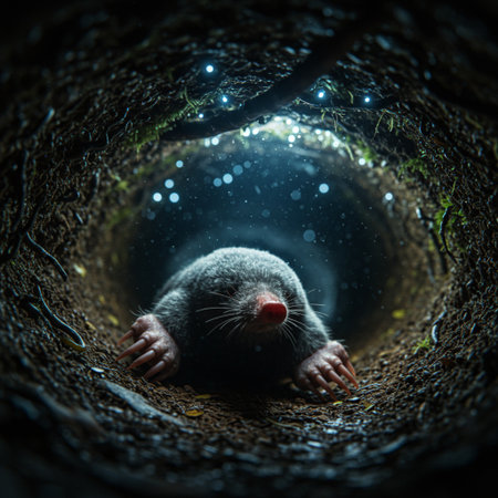 Mole inside soil burrow showing detailed underground tunnels and earthy textures.