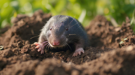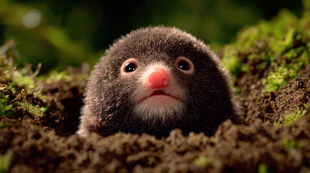 A curious mole, with pink nose and paws, peeks out from the entrance of its freshly dug burrow