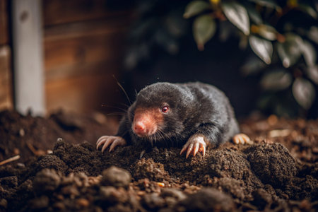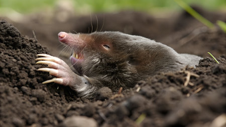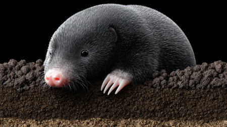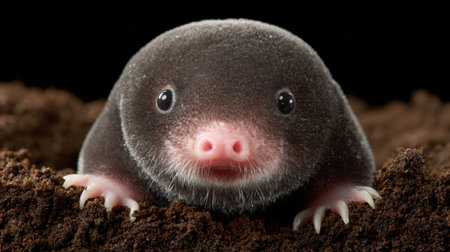 A dark-furred mole breaks through freshly turned earth, its tiny claws gripping the soil.