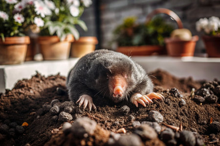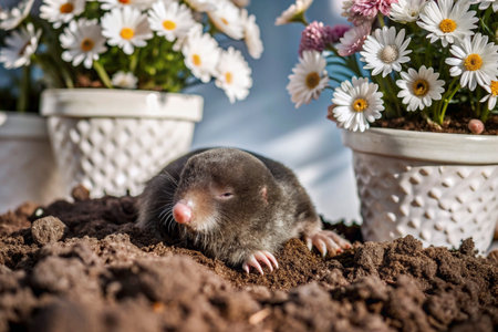 Mole on the ground with flowers in the background. Conceptual image.