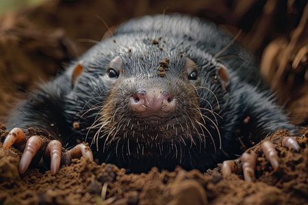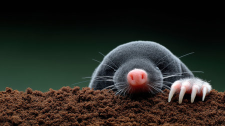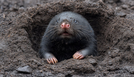 A curious mole peeks out from its underground home, its distinctive pink nose and sharp claws prominent against the dark earth.