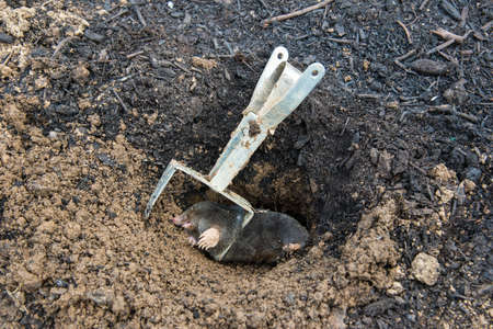 European mole caught by a trap while crawling out of the tunnel