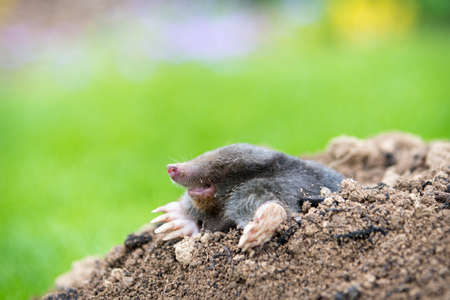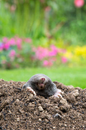 Mole, Talpa europaea, making mole hill and damaging beautiful lawn and flower garden.