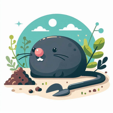 Vector cartoon illustration of a mole digging a hole in the ground.