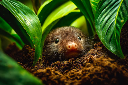 A charming subterranean creature with tiny eyes and a soft snout emerges amid vibrant leaves and dense greenery, evoking nature?s hidden wonder.