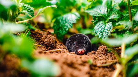 A tiny mole peeks out from a hidden tunnel beneath vibrant leaves, blending seamlessly with the thriving greenery of a flourishing garden.