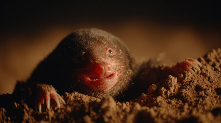 Mole in soil tunnel with visible roots, underground burrow, and earthy textures..