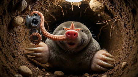 A mole with a camera and tentacles in a tunnel underground
