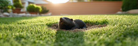 Curious Mink Mole Peeking from Burrow Entrance, Wildlife Encounter in Lush Green Lawn