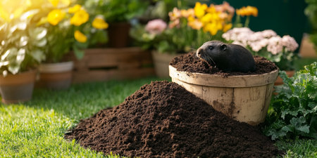 AI Generated. Mole peeking from the mole hill in the garden