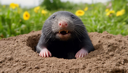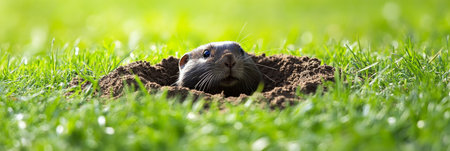 Curious Mole Emerging from Underground Burrow, Surrounded by Lush Green Grass, Wildlife Portrait