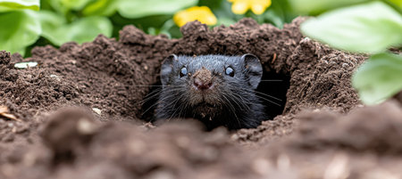 Close-up portrait of a vole emerging from its burrow in the garden., Wildlife photography.