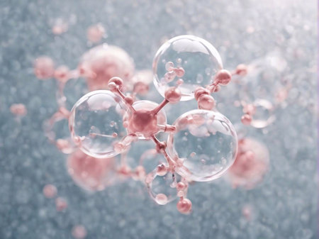 A close-up of a molecular structure featuring pink spheres against a gentle pastel background at dawn, illustrating the beauty of science.