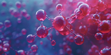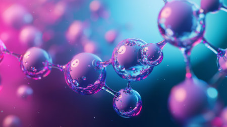 A detailed macro view of a shimmering molecular structure composed of interconnected spheres in shades of pink, blue, and purple, suggesting a scientific or...