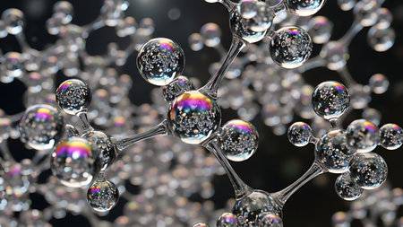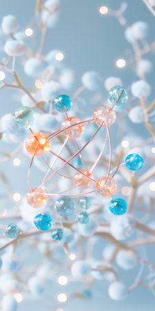 This abstract image captures the intricate beauty of a molecular structure with glass-like spheres, reflecting colorful shades in a modern design.
