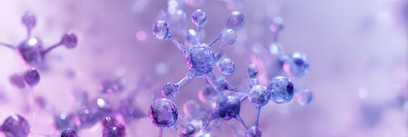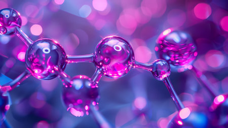 An illustration features a molecular structure rendered with a three-dimensional effect. The image showcases spheres and connecting lines illuminated with blue and purple hues, possibly indicating a scientific or technological theme. This visualization is set against a dark backdrop, and could be utilized for scientific publications or advertising materials.