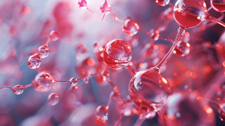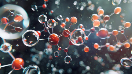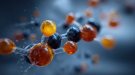 This image illustrates a detailed molecular structure displaying organic compounds with droplets, representing scientific research and innovation.