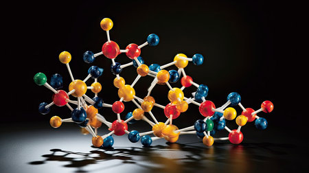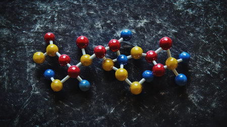 A colorful molecular model depicting a chemical structure is arranged on a dark, textured surface
