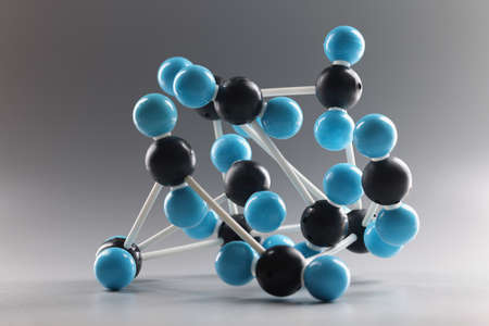 Molecular model structure, miniature on grey background, blue and black cells connected