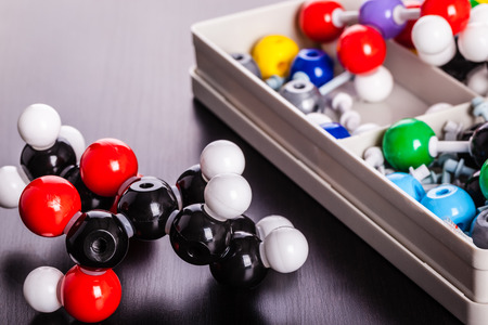 a plastic molecule structure modeling kit on a wooden surface