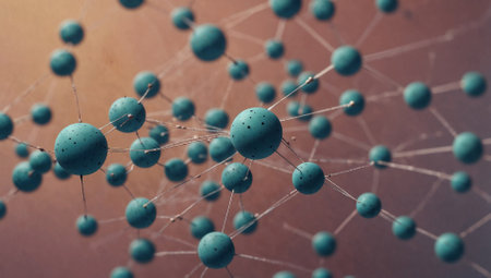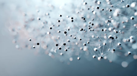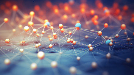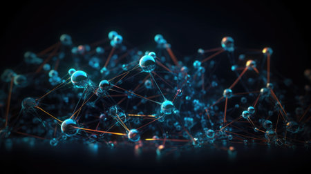 Vibrant depiction of atomic particles linked by connections, showing the beauty of science and chemistry.