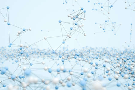 Chaotic connecting structure with spheres and lines. Connection concept. 3D rendering with depth of field
