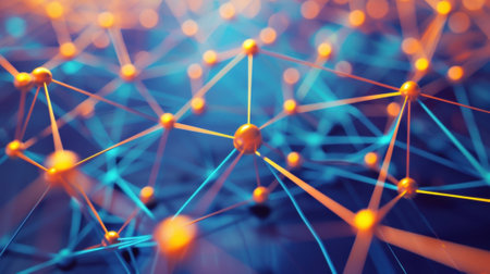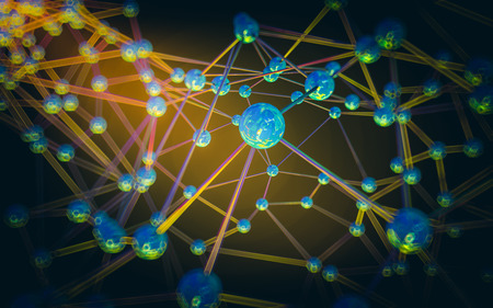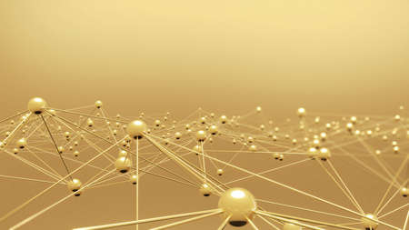 Yellow futuristic abstract network nodes background. Technology and Science Concept. Bokeh light element. Computer communication and connection in Internet of things theme. 3D illustrations rendering.