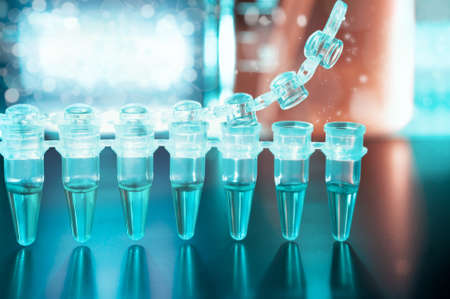 Scientist working with a pipette and a flask, in plastic tubes for DNA studies. Concept of science, laboratory and study of diseases.