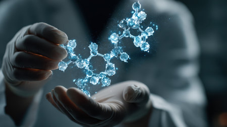 A scientist showcases a glowing molecular structure composed of blue particles, symbolizing advanced research in a modern laboratory environment.
