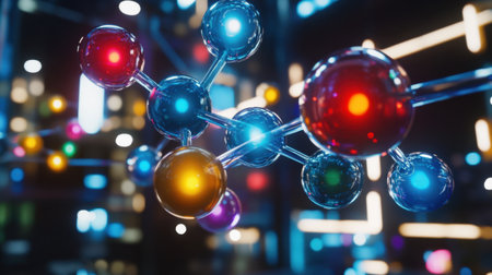 A vibrant and imaginative depiction of atoms and molecules with colorful lights, set against a sleek futuristic background. Perfect for concepts in science and technology.