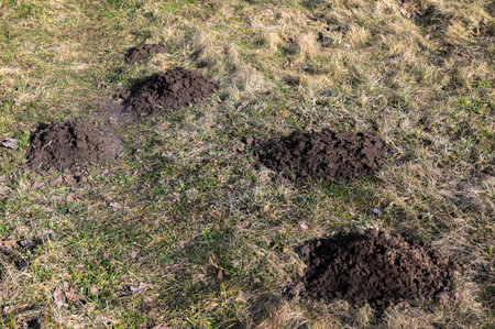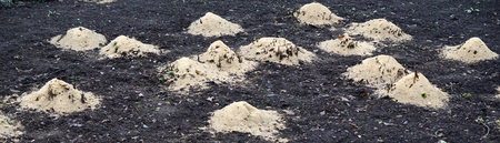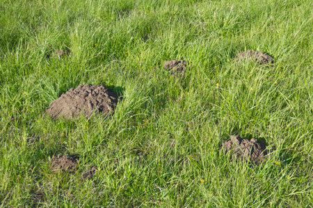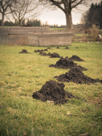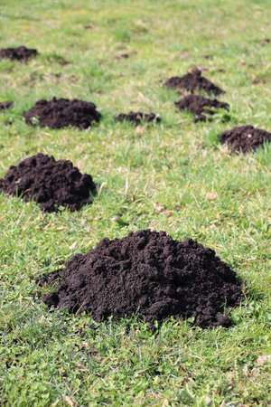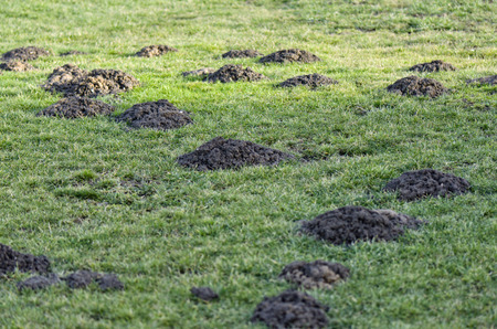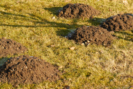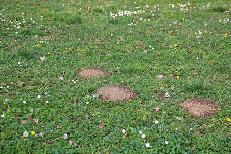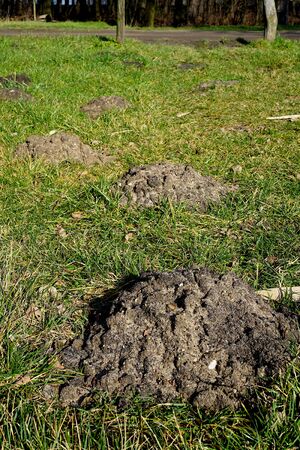 New molehills on lawn made by moles population view on sunny day.