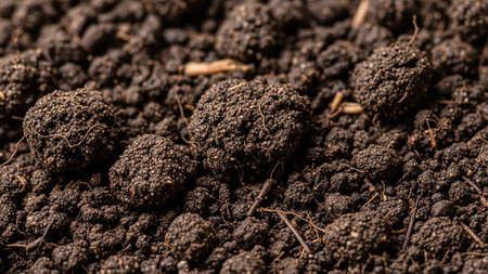 A close-up macro view of dark, crumbly soil with visible clods, small debris, and a rich, earthy texture.