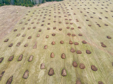 There are round heaps of manure in the field, aerial photo. Application of organic fertilizers in spring and autumn. The concept of working in agriculture for doing business and making a profit.