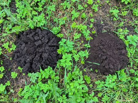 Piles of black earth piled by mole on grass.