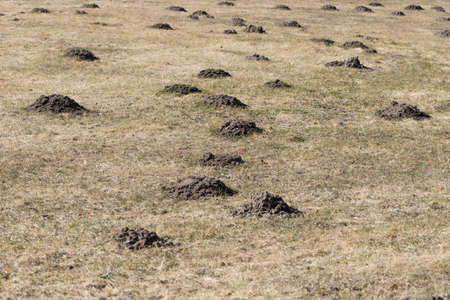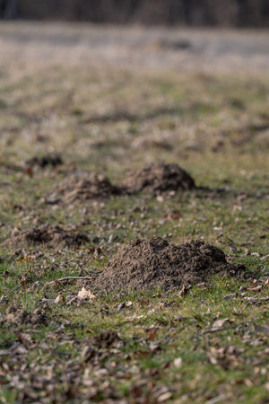 Fresh molehills at meadow in the morning
