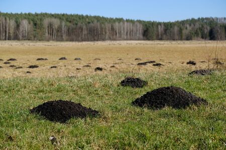 Many moles in a mountain meadow on a sunny day in early spring.New molehills on lawn made by moles population view on sunny day.