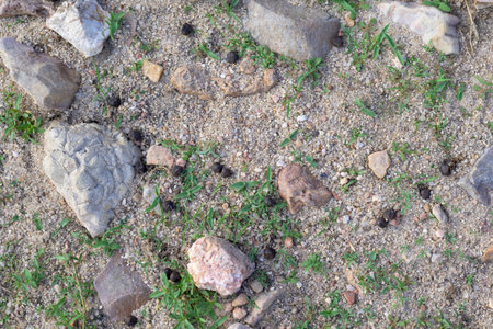 Closeup of goat droppings scattered on sandy soil with small stones and green sprouts creating a natural rural texture background