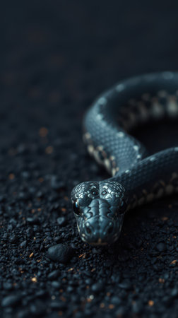 A snake showcases its unique scales and forked tongue in a dramatic low-light environment