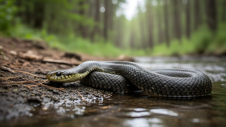 A black snake coiled on the muddy bank of a forest stream. The reptile's dark scales glisten near the water, capturing a moment of wildlife activity in a natural woodland environment.