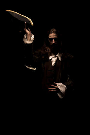 blur or defocus image of Pirate coming out of the darkness welcomes viewer with hat in hand