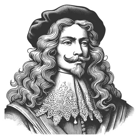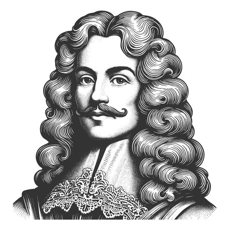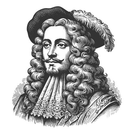 aristocratic man with long curly hair, lace collar, and elegant clothing from historical era sketch engraving generative ai fictional character vector illustration. Scratch board. Black and white.