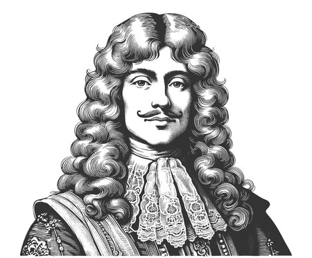 aristocratic man with long curly hr, lace collar, and elegant clothing from historical era sketch engraving fictional character raster illustration. Scratch board. Black and white.