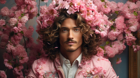 Portrait of a handsome young man with long curly hair and pink flowers in his hair