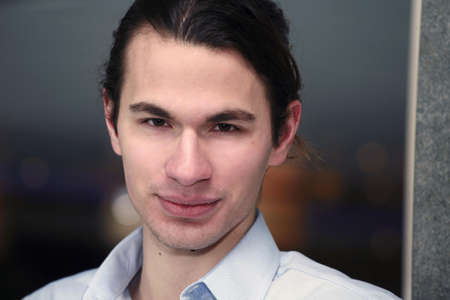 Portrait of a young male model wearing elegant shirt posing dreamily at street looking away.