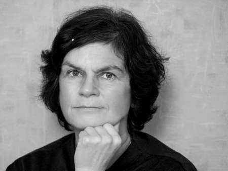 A woman stands in a modern space, surrounded by smooth walls. Light from a window highlights her face while shadows cover other areas. She looks towards the light.