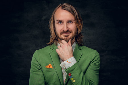 Portrait of sceptical creative man in green blazer on the dark background.